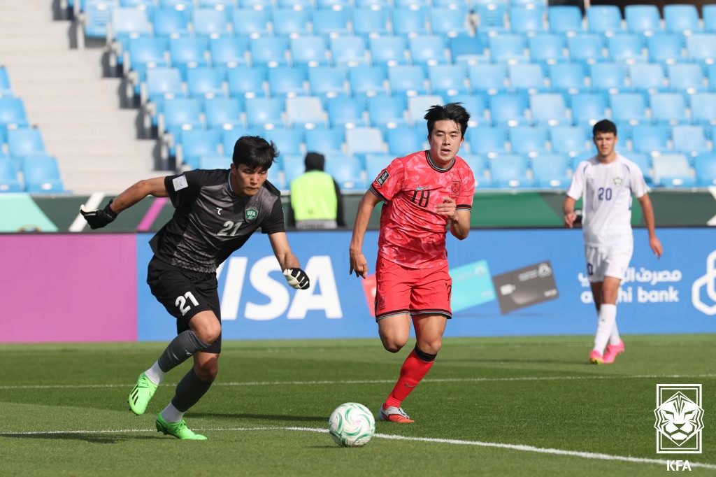 전반전은 답답한 공방전이었다. 한국은 전반 6분 코너킥 상황에서 강성진의 슈팅이 떴고, 전반 34분 김도현이 페널티 박스 안에서 넘어졌으나 파울이 선언되지 않는 불운도 있었다. 오히려 전반 37분과 43분 우즈베키스탄의 날카로운 슈팅에 실점 위기를 맞으며 불안한 0-0 균형을 이어갔다.