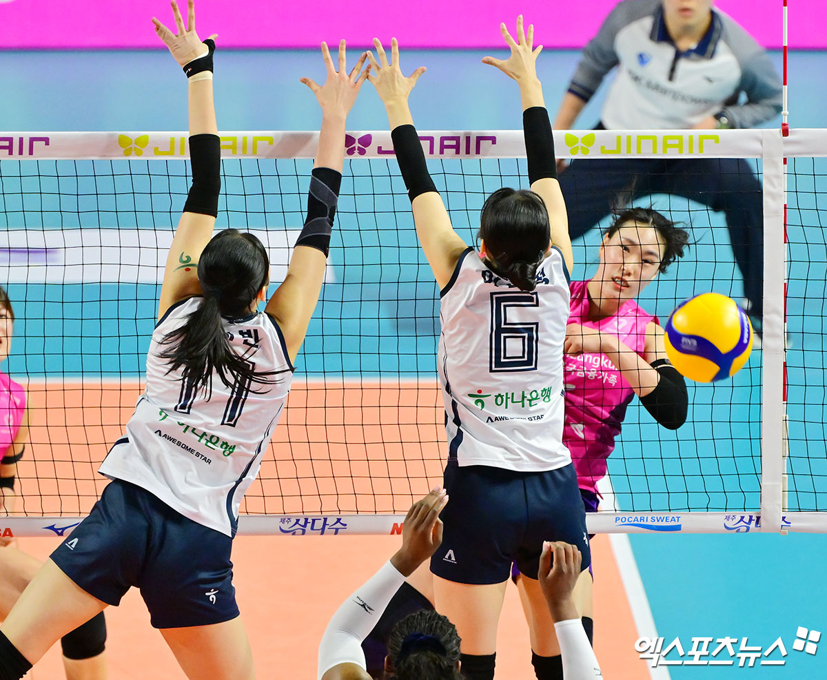 (엑스포츠뉴스 인천, 김한준 기자) 14일 오후 인천 부평구 삼산월드체육관 열린 '진에어 2025-2026 V-리그' 흥국생명과 한국도로공사의 경기, 흥국생명 최은지가 공격을 시도하고 있다.