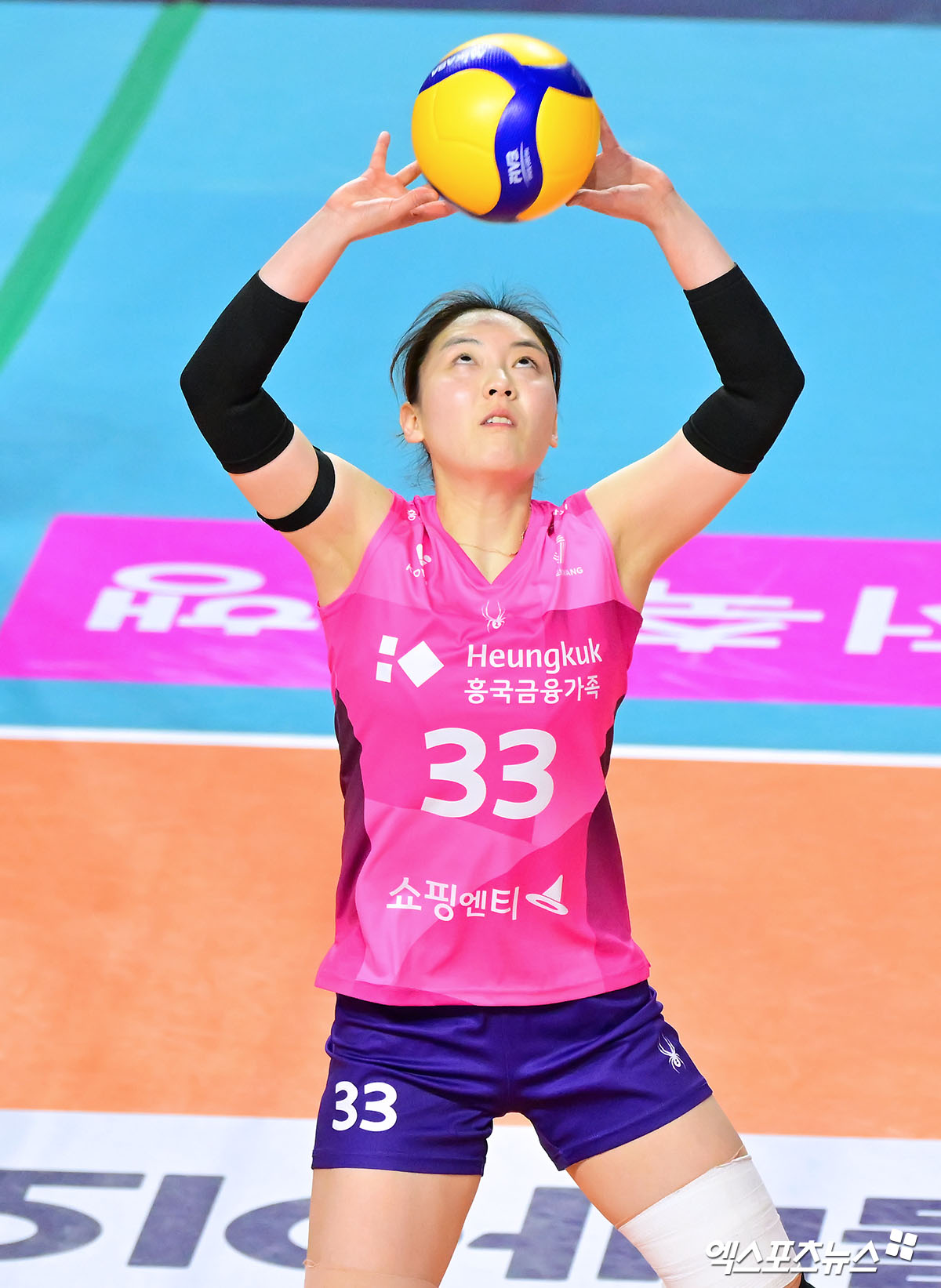 (엑스포츠뉴스 인천, 김한준 기자) 14일 오후 인천 부평구 삼산월드체육관 열린 '진에어 2025-2026 V-리그' 흥국생명과 한국도로공사의 경기, 흥국생명 이나연이 토스를 하고 있다.