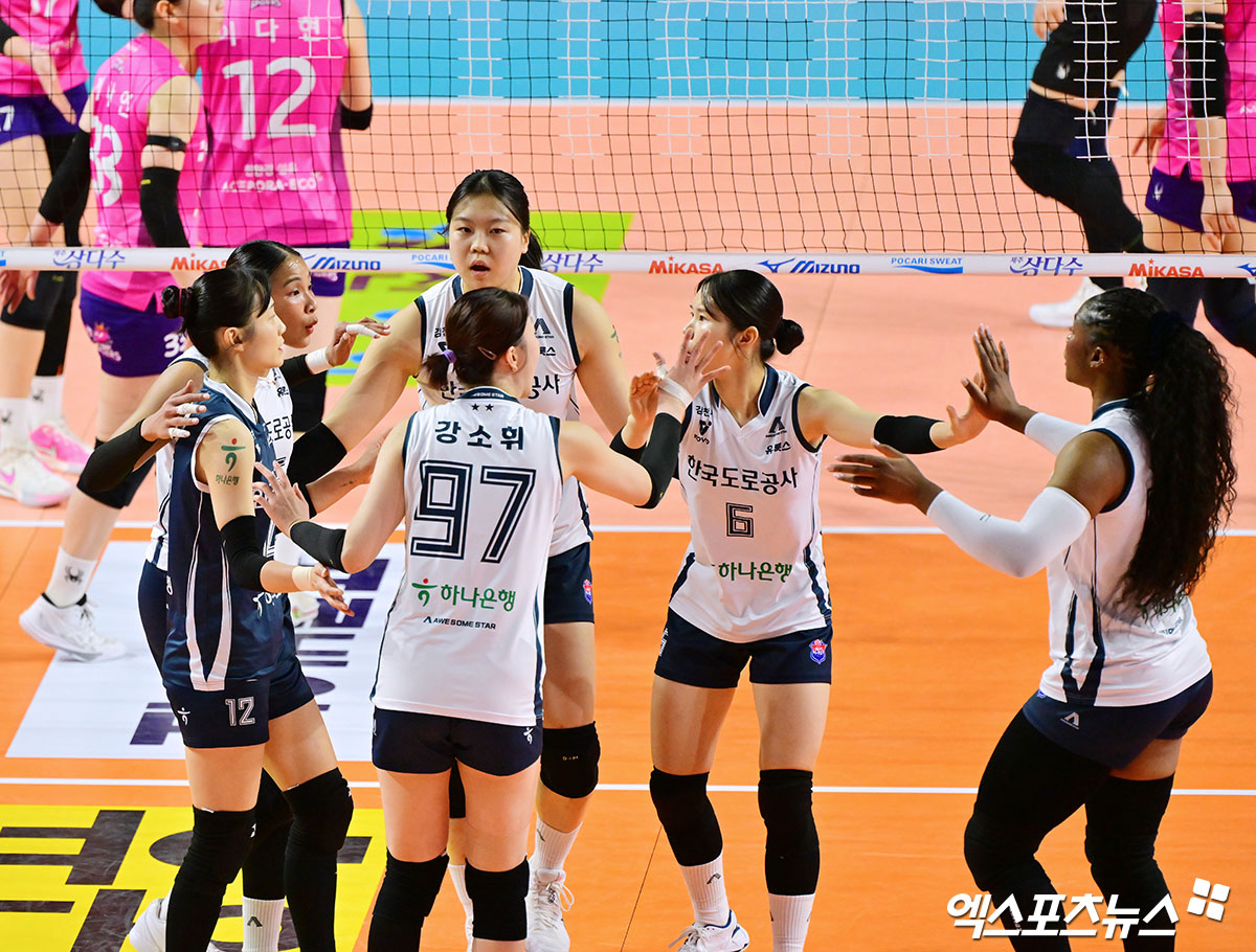 (엑스포츠뉴스 인천, 김한준 기자) 14일 오후 인천 부평구 삼산월드체육관 열린 '진에어 2025-2026 V-리그' 흥국생명과 한국도로공사의 경기, 도로공사 선수들이 득점 후 기뻐하고 있다.