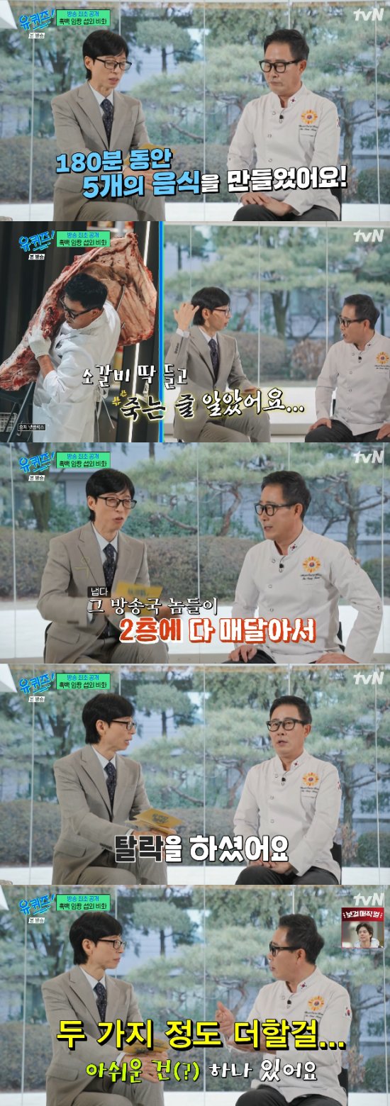 또 유재석은 "180분동안 5개의 음식을 만드셨다. 소갈비를 든 모습이 정말 멋있었다"고 했고, 임 셰프는 "죽는 줄 알았다. 소고기를 2층에 매달아 놨더라. 1층에 둬도 되는 거 아니냐. 제작진 놈(?)들"이라고 말해 큰 웃음을 줬다.