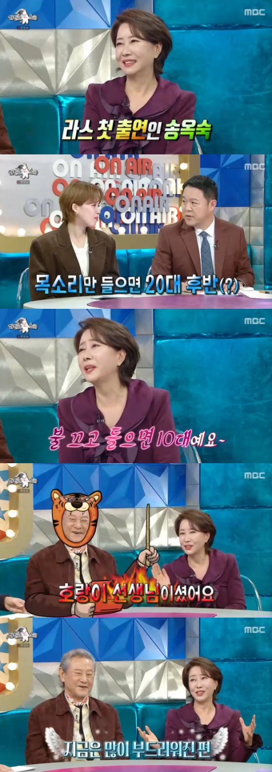 이날 송옥숙은 '라디오스타' 첫 출연에 설렘을 감추지 못했다. '라디오스타' MC들은 송옥숙의 카랑카랑한 목소리에 깜짝 놀랐고, 송옥숙은 "내 목소리를 불 끄고 들으면 10대"라고 시작부터 화끈한 입담을 보였줬다.