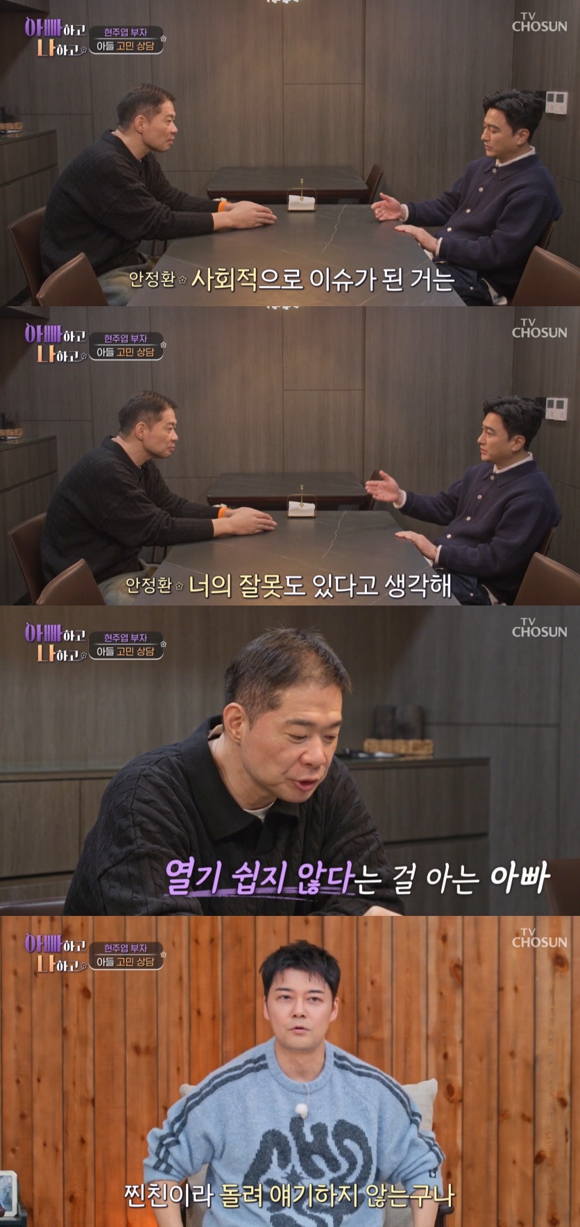 현주엽은 "나 때문에 그렇게 됐더라도 나를 피할 필요는 없지 않나"라고 받아쳤고, 안정환은 "아니다. 입장 바꿔 생각해라. 원망을 누굴 하겠냐. 사회적 이슈가 된 건 너의 잘못도 있다고 생각한다. (논란을) 만들었으니까. 난 친구니까 무조건 네 편이다. 그런데 시간이 좀 걸릴 거다"라고 일침을 날렸다.