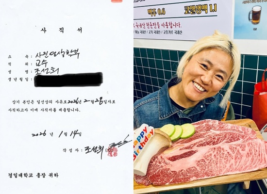 사직서에는 경일대학교 사진영상학부 교수로 재직했던 조선희가 "일신상의 사유로 2026년 2월 28일자로 사직하고자 이에 사직서를 제출한다"는 내용이 담겨 있다.