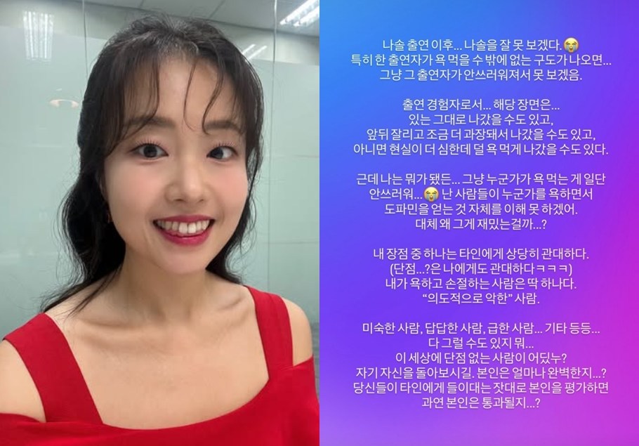 이어 "근데 나는 뭐가 됐든, 그냥 누군가가 욕 먹는 게 일단 안쓰럽다. 난 사람들이 누군가를 욕하면서 도파민을 얻는 것 자체를 이해 못 하겠다"라며 지적했다.