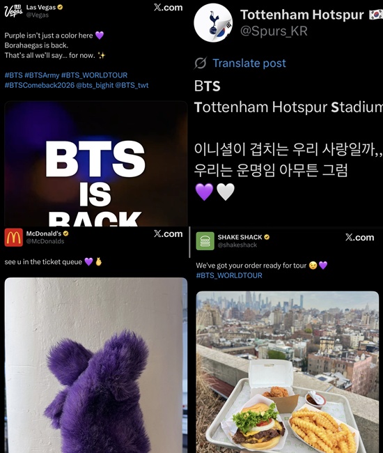 각종 브랜드들도 반응했다. 컬래버레이션 메뉴를 선보였던 햄버거 브랜드 맥도날드는 보라색 장갑을 끼고 손가락으로 'K-하트'를 그리는 이미지와 함께 "티켓 대기열에서 만나자"며 설렘을 표했다.