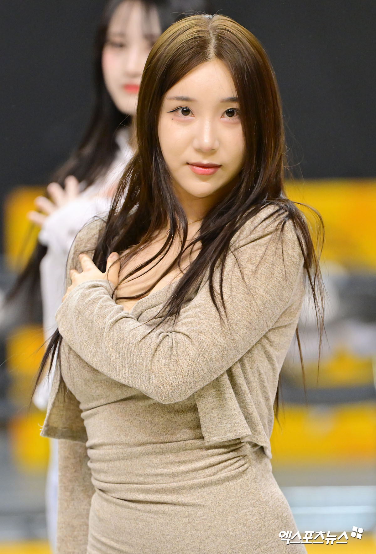 (엑스포츠뉴스 의정부, 김한준 기자) 16일 오후 경기도 의정부실내체육관에서 열린 '진에어 2025-2026 V-리그' KB손해보험과 대한항공의 경기, 김현영 치어리더가 리허설에 임하고 있다.