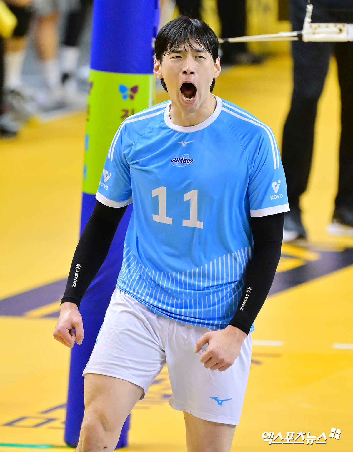(엑스포츠뉴스 의정부, 김한준 기자) 16일 오후 경기도 의정부실내체육관에서 열린 '진에어 2025-2026 V-리그' KB손해보험과 대한항공의 경기, 대한항공 김선호가 포효하고 있다.