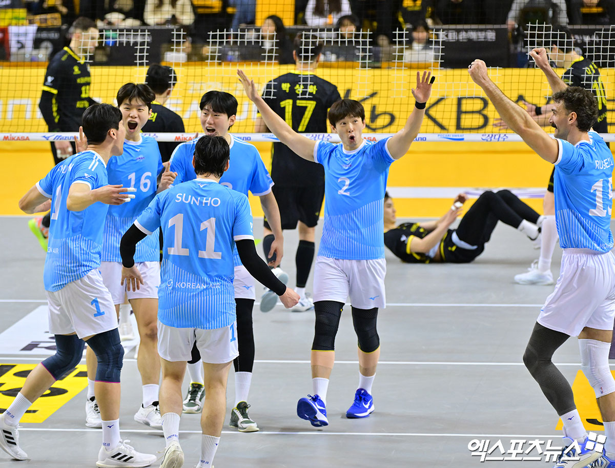 (엑스포츠뉴스 의정부, 김한준 기자) 16일 오후 경기도 의정부실내체육관에서 열린 '진에어 2025-2026 V-리그' KB손해보험과 대한항공의 경기, 대한항공 선수들이 기뻐하고 있다.