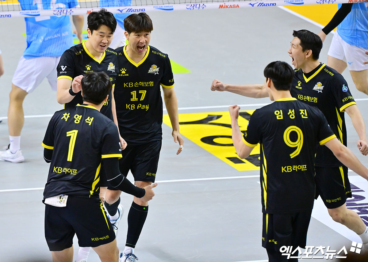 (엑스포츠뉴스 의정부, 김한준 기자) 16일 오후 경기도 의정부실내체육관에서 열린 '진에어 2025-2026 V-리그' KB손해보험과 대한항공의 경기, KB손해보험 선수들이 득점 후 기뻐하고 있다.
