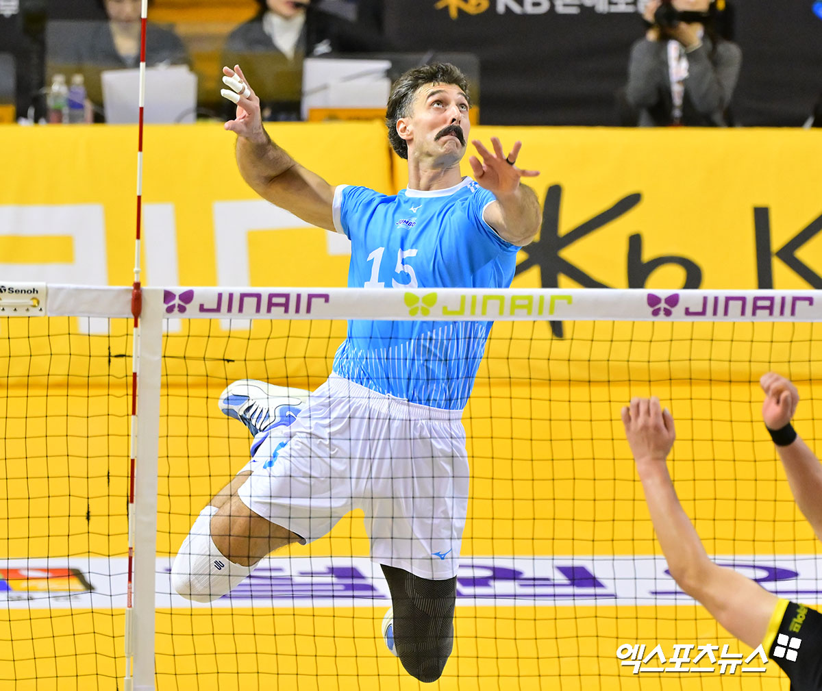 (엑스포츠뉴스 의정부, 김한준 기자) 16일 오후 경기도 의정부실내체육관에서 열린 '진에어 2025-2026 V-리그' KB손해보험과 대한항공의 경기, 대한항공 러셀이 공격을 시도하고 있다.
