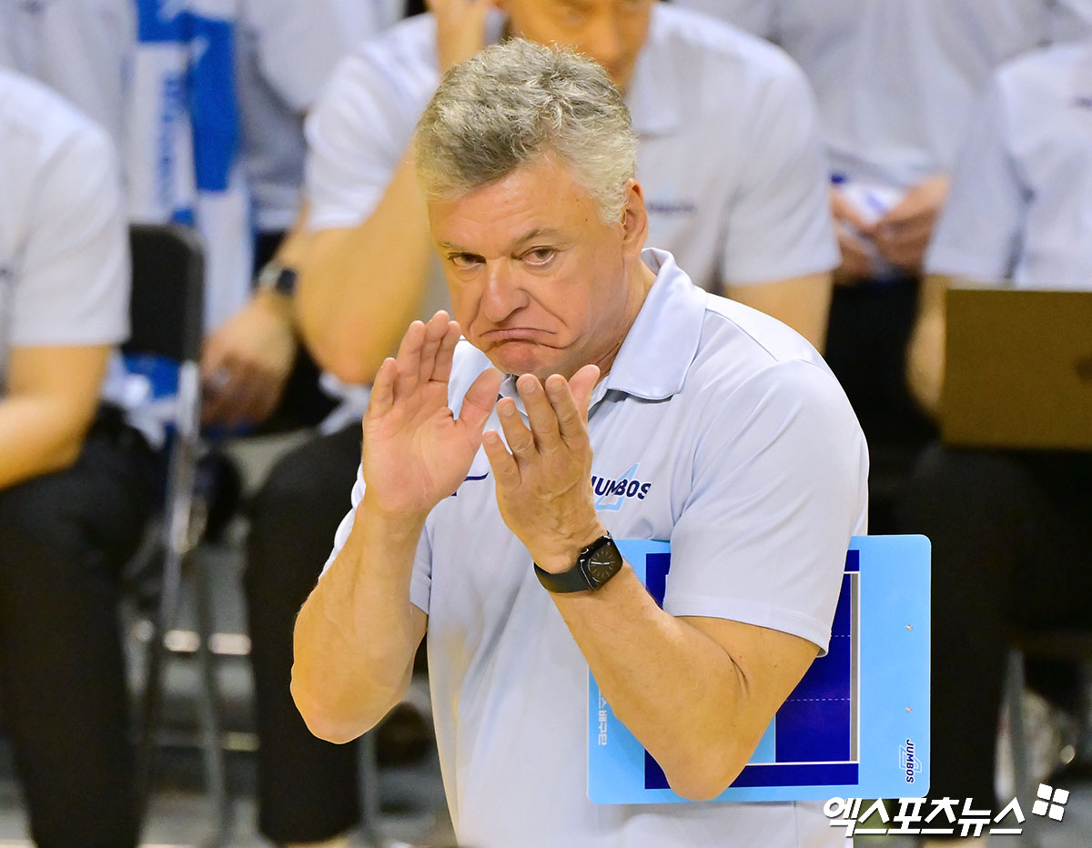 (엑스포츠뉴스 의정부, 김한준 기자) 16일 오후 경기도 의정부실내체육관에서 열린 '진에어 2025-2026 V-리그' KB손해보험과 대한항공의 경기, 대한항공 헤난 감독이 박수를 치고 있다.
