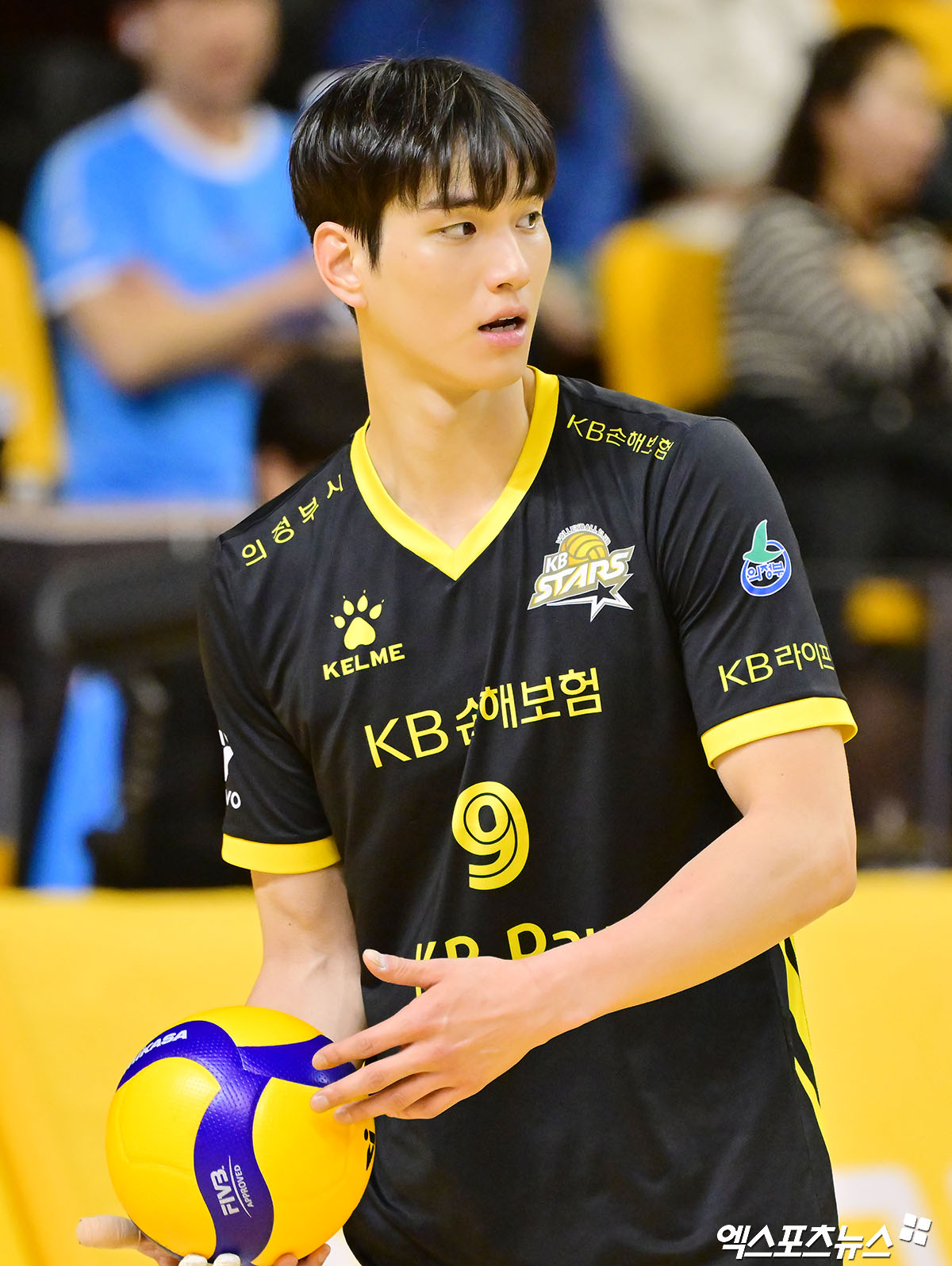 (엑스포츠뉴스 의정부, 김한준 기자) 16일 오후 경기도 의정부실내체육관에서 열린 '진에어 2025-2026 V-리그' KB손해보험과 대한항공의 경기, KB손해보험 임성진이 서브에이스를 기록하고 있다.