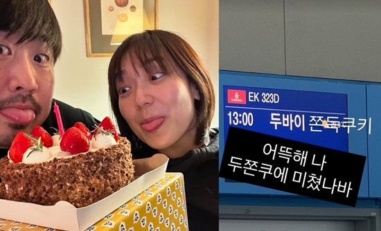 사진 속에는 공항에서 촬영된 장면이 담겼다. 출국 안내 표지판 위에는 '두바이 비행 시간'을 알리는 안내 문구가 보이고, 그 옆에 '쫀득쿠키'라는 문구가 덧붙여져 있어 보는 이들에게 웃음을 안겼다.