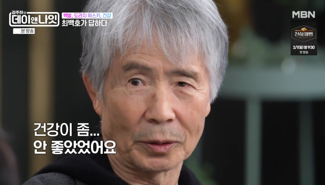 이날 건강에 대한 질문을 받은 최백호는 "건강이 좀 안 좋았었다"며 "건강검진에서 까다로운 질병이 발견돼 체중이 15kg이나 빠졌다. 원래 70kg이었는데 지금은 55kg밖에 안 된다"고 밝혔다.