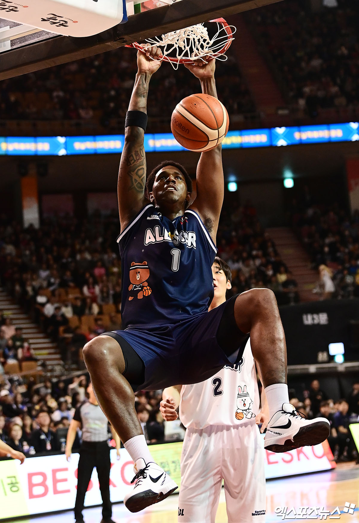 (엑스포츠뉴스 잠실, 박지영 기자) 18일 오후 서울 송파구 잠실실내체육관에서 열린 '2025-2026 LG전자 프로농구 올스타전' 팀 브라운과 팀 코니의 경기, 네이던 나이트가 덩크슛을 성공시키고 있다.