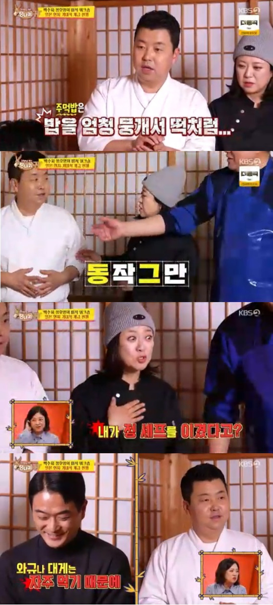 정호영은 일본어를 어려운 김숙과 양준혁을 위해 대신 요리를 소개하면서 "밥을 떡처럼 뭉갰다"는 얘기를 했다.
