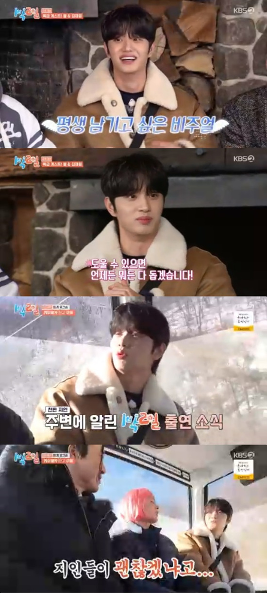 김재원은 케이블카를 타고 이동하면서 주변에 친한 지인들한테 '1박 2일' 출연 소식을 알렸는데 괜찮겠느냐는 말이 돌아왔다며 웃었다.