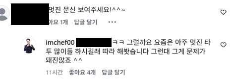 이에 한 네티즌은 임성근의 개인 채널에 '멋진 문신 보여달라'는 댓글을 달았고, 임성근은 "ㅋㅋ그럴까요. 요즘은 아주 멋진 타투 많이들 하시길래 따라 해봤다. 그런데 그게 문제가 되진 않죠^^"라고 직접 답해 눈길을 끈다.