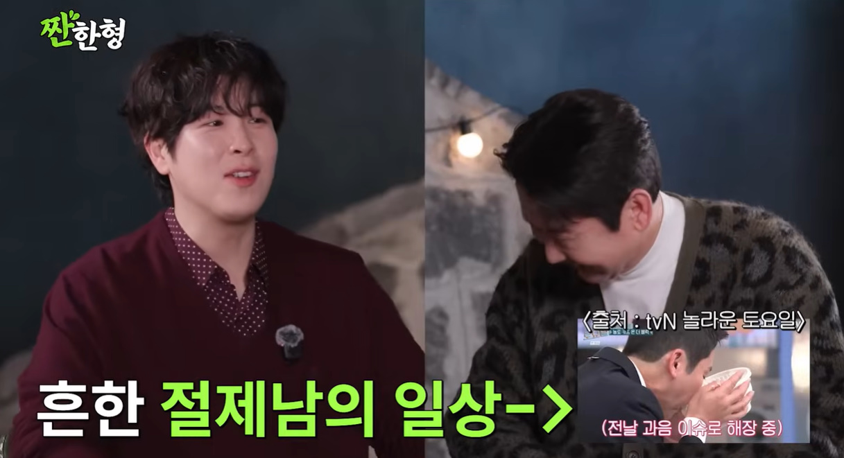 이를 들은 피오는 "형님 제가 그건 확실히 알죠. 완전 절제남이잖아요"라는 반응을 보여 웃음을 줬다. 제작진은 신동엽이 피오와 함께 출연하는 tvN '놀라운 토요일'에서 방송용 음식으로 해장하는 모습이 담긴 캡처 사진을 함께 보여줬다.
