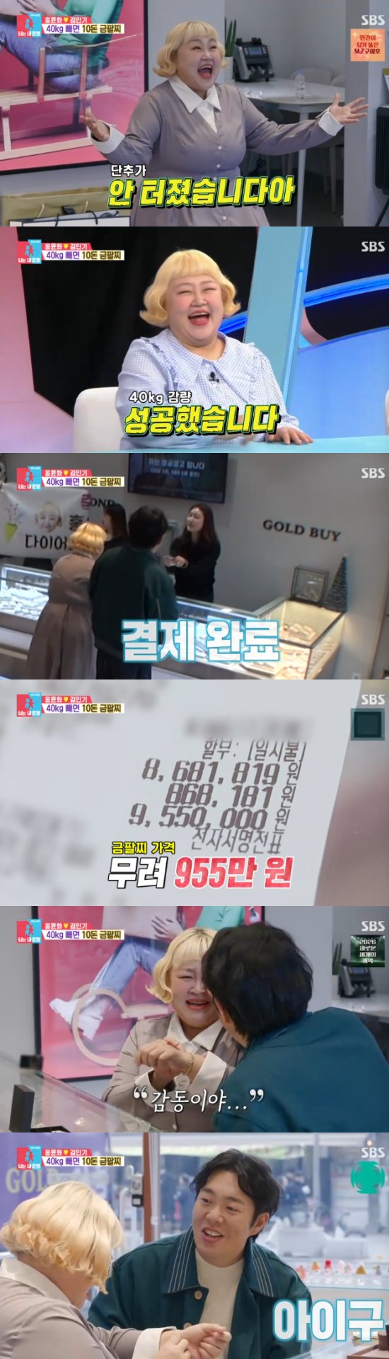 다이어트에 완벽하게 성공한 김민기는 "결제해달라"면서 "고생했다"고 홍윤화를 토닥였다. 김민기는 일시불로 955만원의 금팔찌를 홍윤화에게 선물했다. 홍윤화는 김민기의 선물에 고생했던 옛날을 생각하면서 눈물을 보였다.