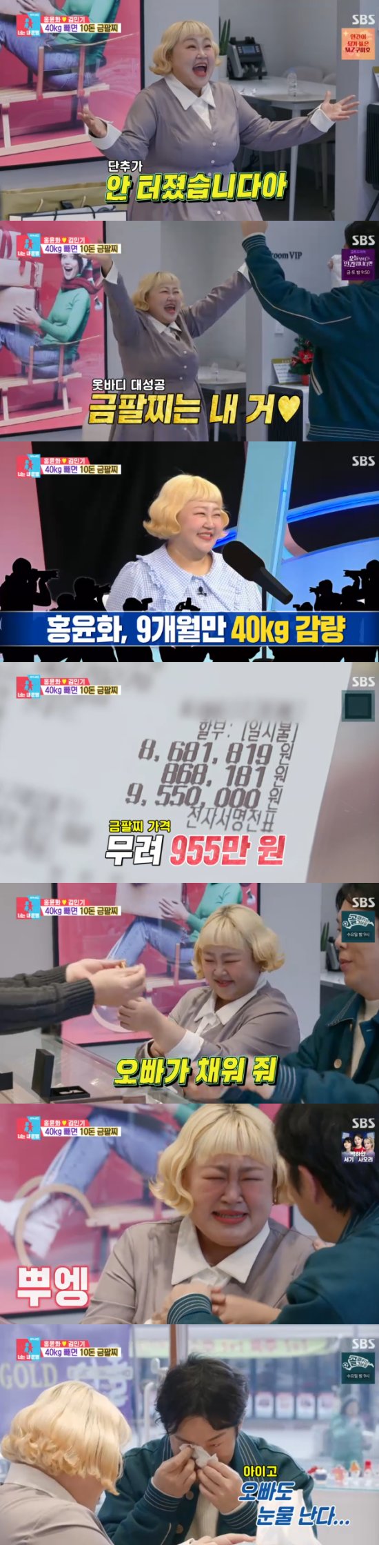 그리고 이날은 홍윤화의 40kg 감량 계체 D-DAY였다. 일단 두 사람은 10돈짜리 금팔찌를 봐뒀던 금은방으로 향했다. 금은방 사장님은 다시 찾은 두 사람의 모습에 "금팔찌를 팔 수 있는 기회가 온거냐"면서 설레했다.