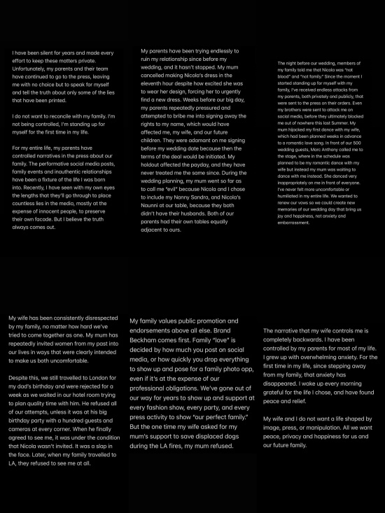브루클린이 가장 강한 어조로 비판한 대상은 '이미지 관리'였다. 그는 "내 부모는 언론을 통해 끊임없이 허위 정보를 퍼뜨려 왔다. 그 거짓말들은 나와 내 아내를 겨냥한 것이었다"며 "그들은 항상 화해를 원한다고 말하지만, 실제 행동은 우리 관계를 망치는 것이었다"고 주장했다.