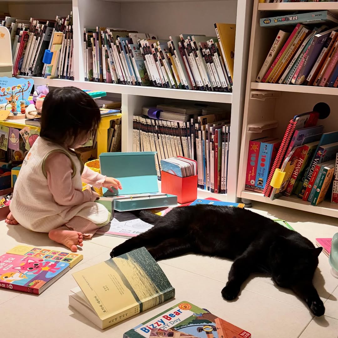 이어 게시된 사진 속 다홍이는 독서에 몰두하던 재이가 벌떡 일어나 자신에게도 다가오자, 잠에서 깨 동그란 눈으로 재이를 빤히 바라보아 웃음을 자아낸다.