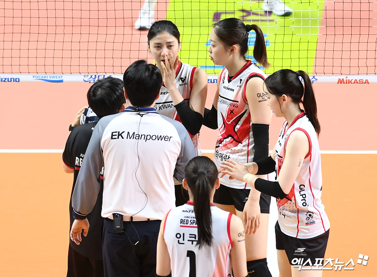 (엑스포츠뉴스 장충, 고아라 기자) 20일 오후 서울 장충체육관에서 열린 '진에어 2025-2026 V-리그' GS칼텍스와 정관장의 경기, 정관장 박혜민이 부상을 확인하고 있다.