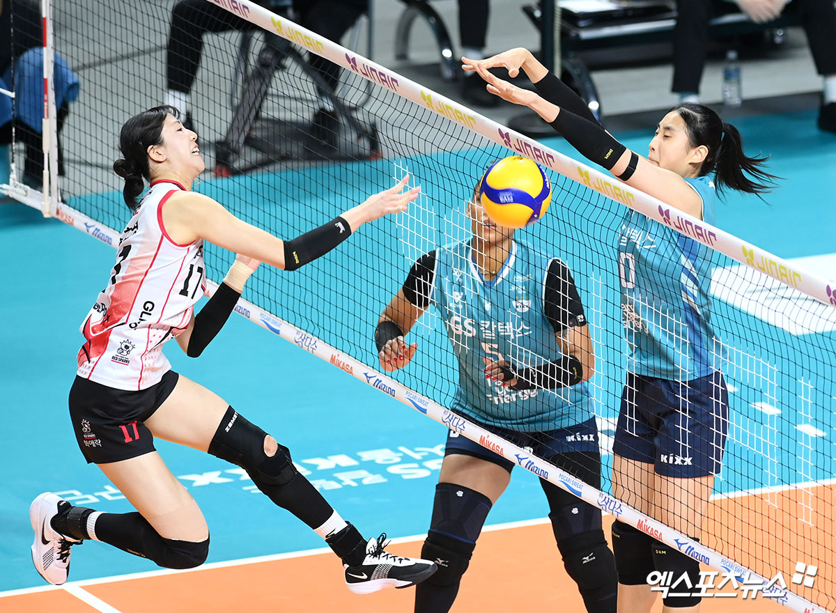 (엑스포츠뉴스 장충, 고아라 기자) 20일 오후 서울 장충체육관에서 열린 '진에어 2025-2026 V-리그' GS칼텍스와 정관장의 경기, GS칼텍스 최유림이 블로킹을 시도하고 있다.