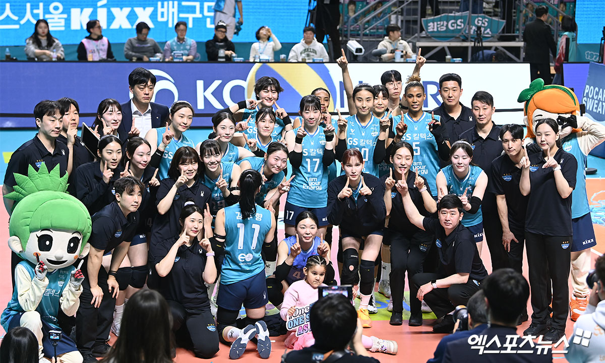 이날 경기를 승리로 마친 GS칼텍스 선수들이 기뻐하고 있다.