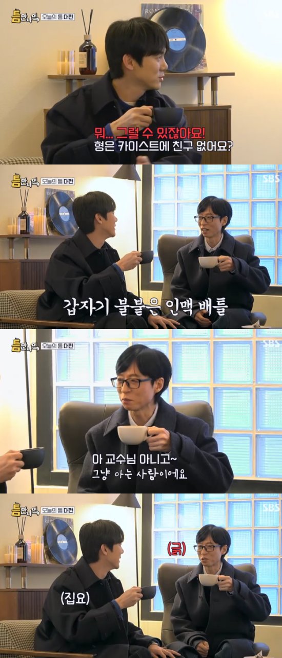 이에 유재석은 "지금 친구 공부 잘한다고 자랑하는거야?"라고 놀렸고, 유연석은 "카이스트에 친구 없으세요?"라면서 받아쳤다. 이에 유재석은 "아는 분이 있다"고 했고, 유연석은 "교수님? 총장님?"이라고 긁어(?) 웃음을 자아냈다.