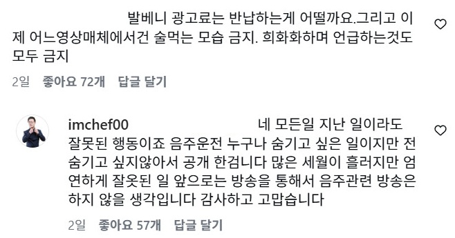 술 광고로도 비난을 받았던 그는 "광고료는 반납하는 게 어떠냐. 어느 매체건 술 먹는 모습 금지, 희화화하며 언급하는 것도 모두 금지다"라는 팬의 말에 "지난 일이라도 잘못된 행동이다. 음주운전 누구나 숨기고 싶은 일이지만 전 숨기고 싶지 않아서 공개한 거다. 많은 세월이 흘렀지만 엄연하게 잘못돈 일. 앞으로는 방송을 통해 음주관련 방송은 하지 않을 생각이다"라고 밝히며 추후 방송 방향에 대해 언급했다.