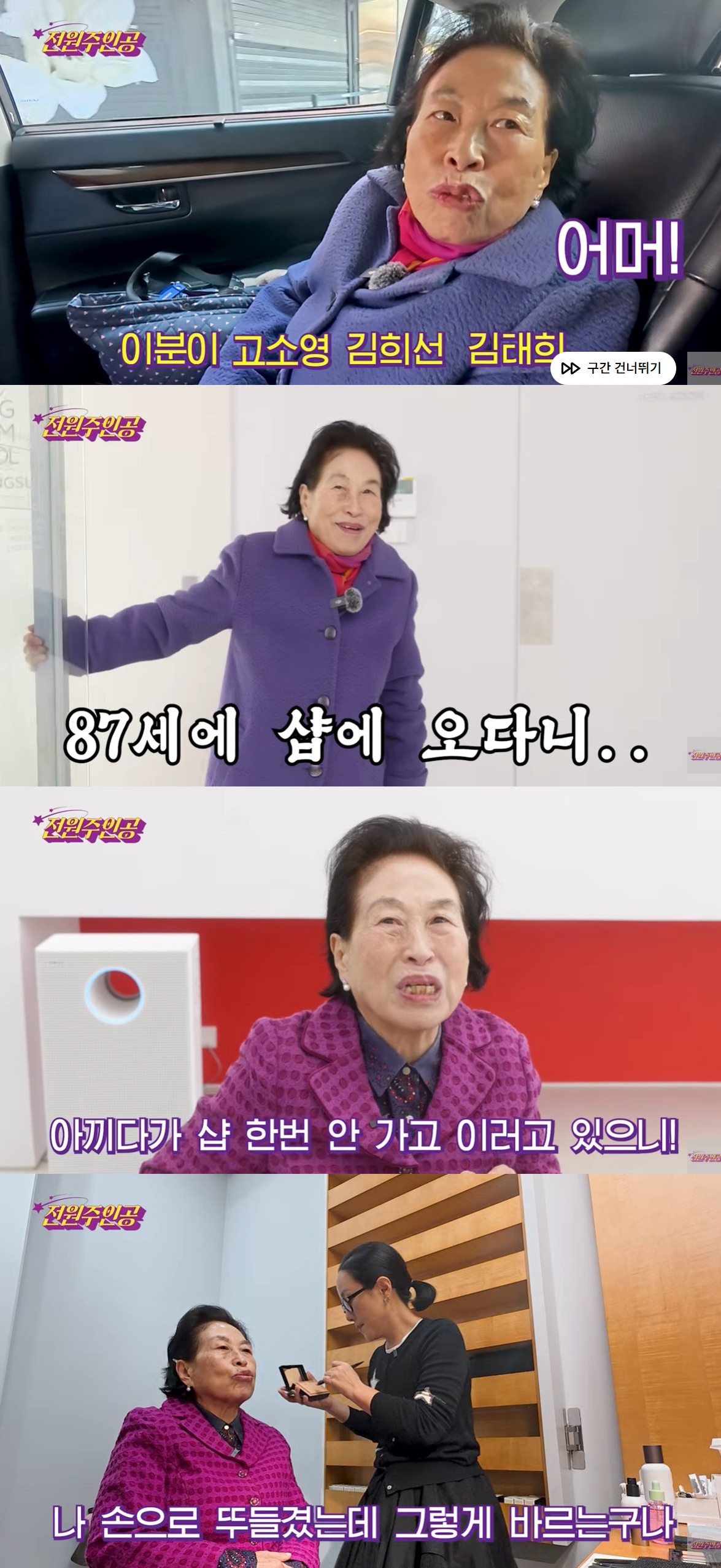 섬세하게 여러 차례 피부 메이크업을 받던 전원주는 브러쉬 등을 이용하는 정샘물을 보며 "난 손으로 두드렸는데 이렇게 바르는구나. 붓으로 두드리는 건 처음 본다"고 소감을 전했다.