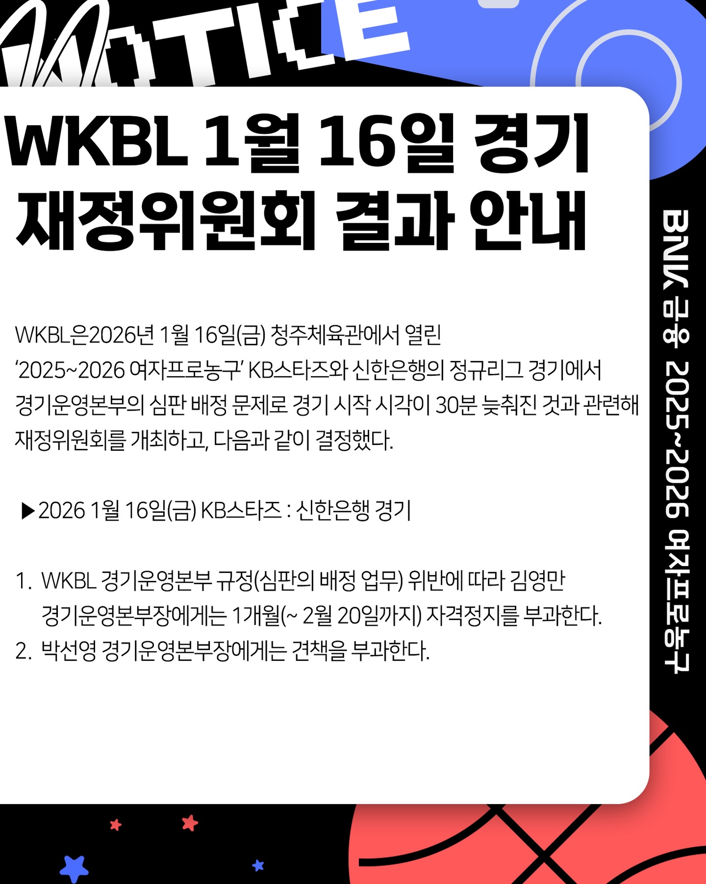 WKBL은 경위서를 받고 지난 20일 재정위원회를 열어 두 사람에 대한 징계를 결정했다.
