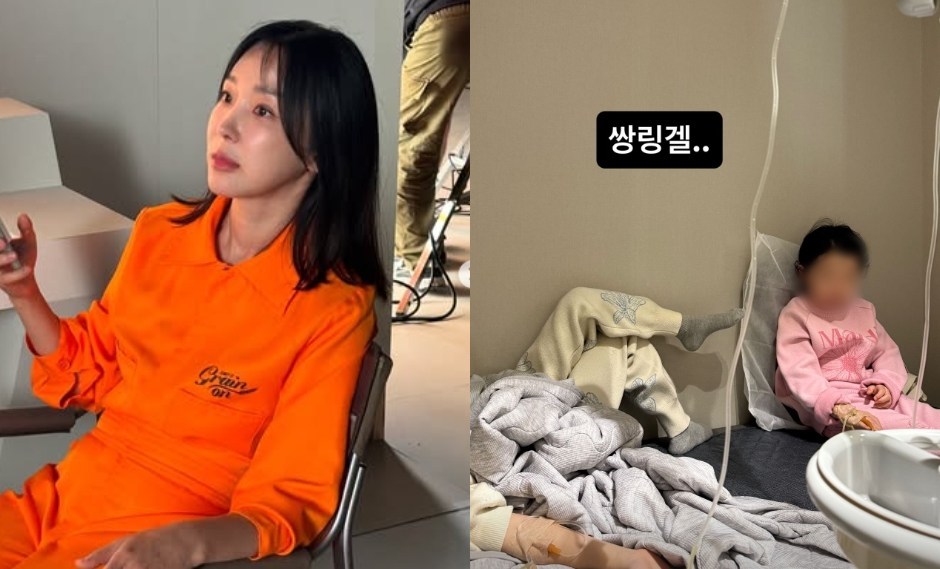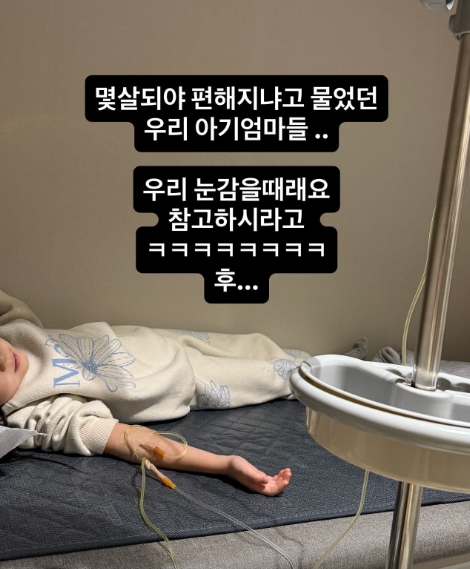이어 이지혜는 "쌍링겔.."이라는 글과 또 다른 사진을 공개했다. 사진 속에는 함께 나란히 링거를 맞고 있는 딸들의 모습이 담겨 안타까움을 자아냈다.