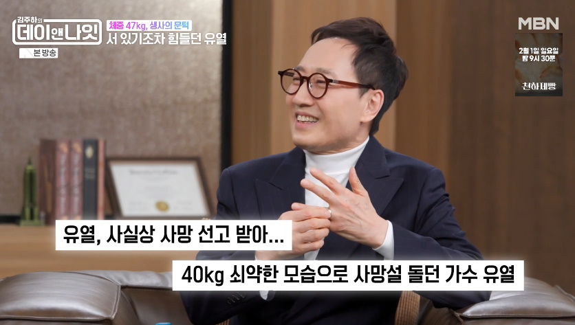 24일 방송된 MBN ‘김주하의 데이앤나잇’ 9회에서는 유열이 게스트로 출연해 폐섬유증 투병 후 7년 만의 근황을 전했다.