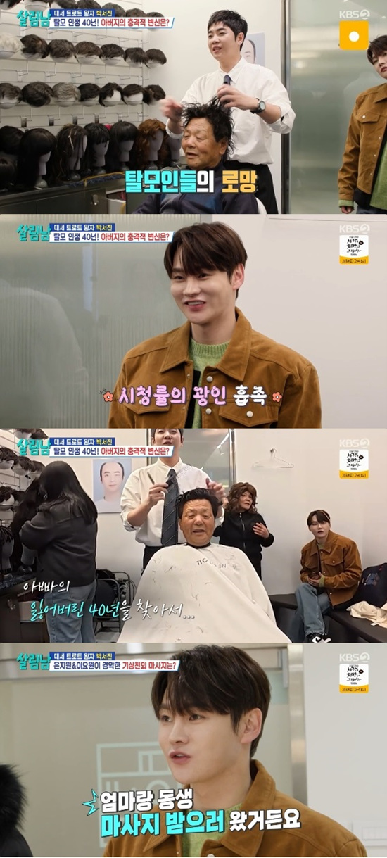 박서진은 가발 전문가 조상현의 손길로 다시 태어난 아버지 모습에 "10년은 젊어진 것 같다. 확 달라졌다"고 말했다.