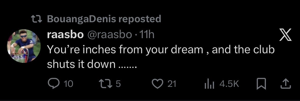 부앙가는 21일 자신의 X(구 트위터) 계정을 통해 한 팬의 게시물을 공유했다. 해당 글에는 "꿈을 이루기까지 몇 인치밖에 남지 않았는데, 구단이 이를 막아버렸다"는 문장이 담겨 있었다.