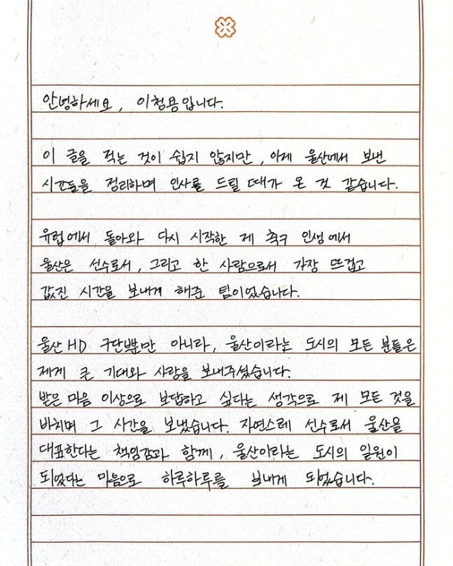 지난 시즌을 끝으로 울산과의 계약이 만료돼 자유계약(FA) 신분이 됐으나 울산과의 동행을 끝내기로 결정한 이청용은 자필 편지로 울산 팬들에게 마지막 인사를 전했다.