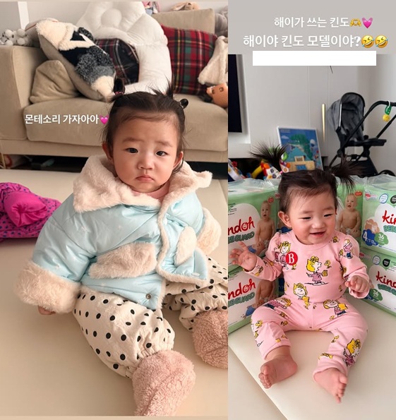 해이는 기저귀 앞에서 모델 포즈를 취하는가 하면, 양갈래 머리를 안 채 더욱 귀여워진 미모를 공개해 눈길을 끈다.