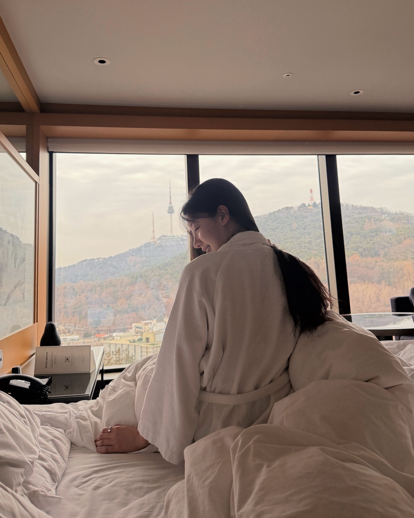 호텔에서 분홍색 파자마를 입고 셀카를 찍은 사진이나 하얀색 샤워가운을 입은 사진을 올리며 근황을 전했다.