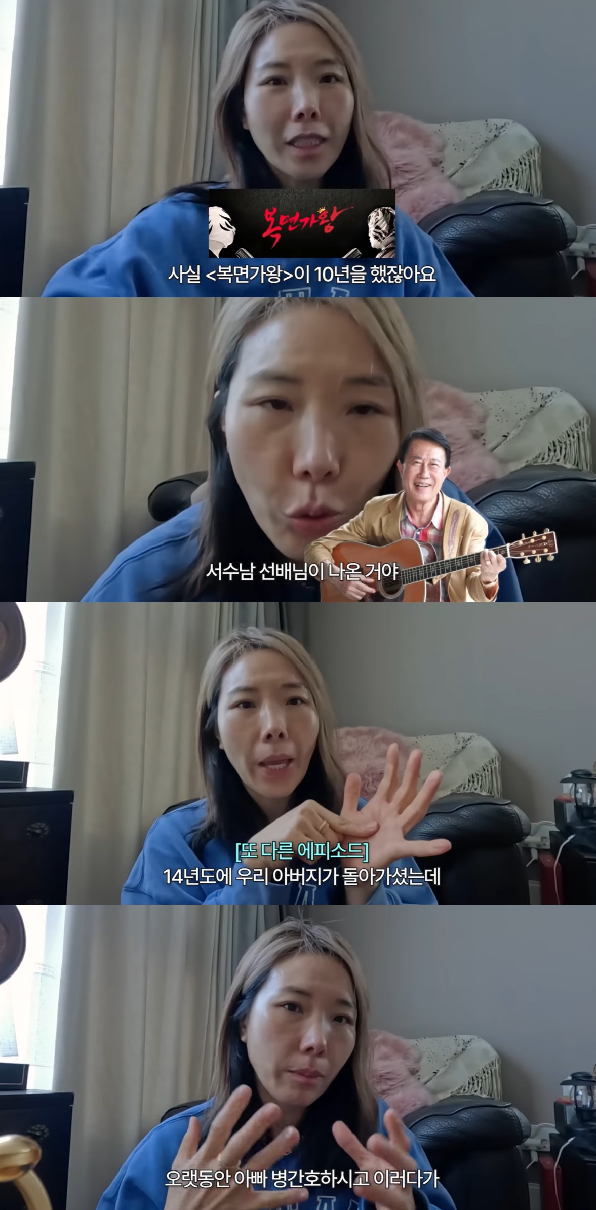 신봉선은 "14년도에 아버지가 돌아가시고 15년도에 '복면가왕'을 했다. 엄마가 음악대장(하현우) 노래 들으면서 위로를 받았다. 아버지가 편찮으시고 병간호 하셨는데 돌아가셨다. 그 헛헛함을 노래로 위로 받으신 거다"라고 자신의 이야기를 꺼냈다.