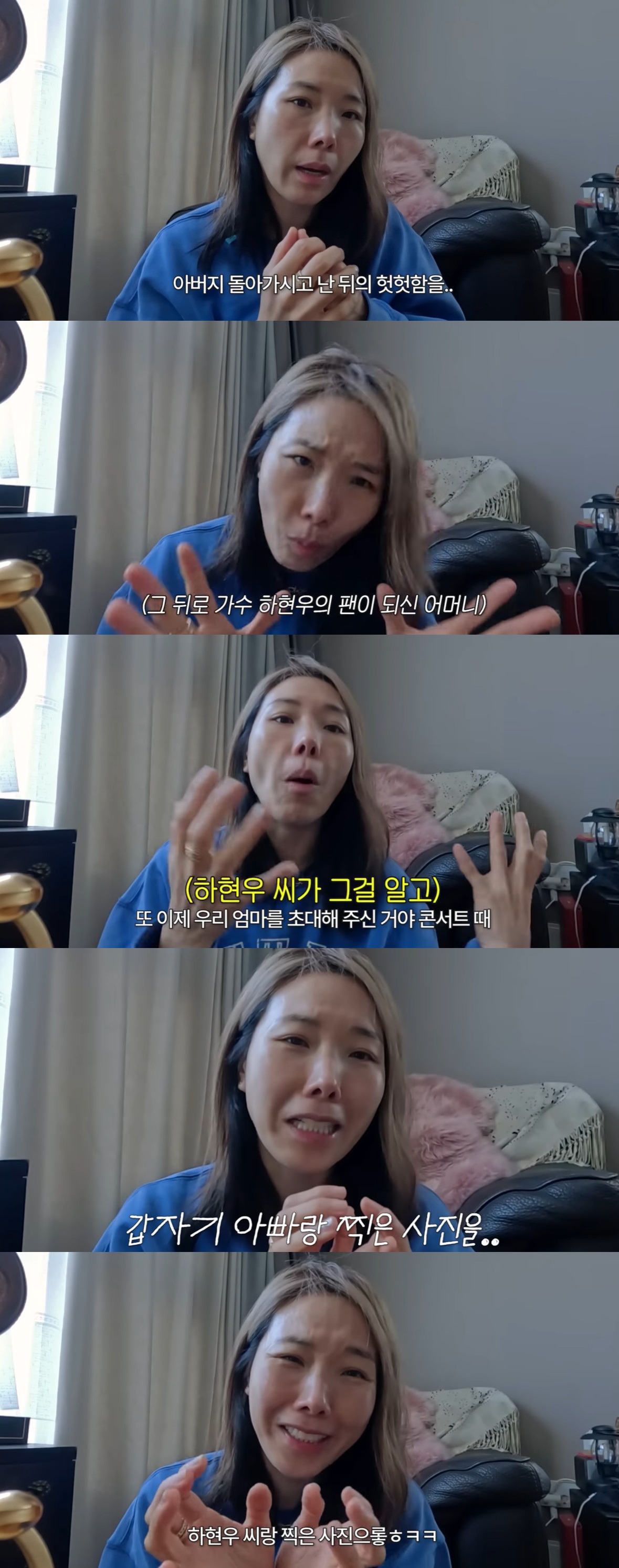 "엄마가 하현우 씨를 너무 좋아한다. (하현우가) 우리 엄마를 콘서트 때 초대해주셨다"는 그는 "갑자기 아빠랑 찍은 사진을 프로필 사진으로 걸어둔 엄마가 하현우와 찍은 사진으로 갈아끼웠더라"모 모친의 팬심을 이야기했다.