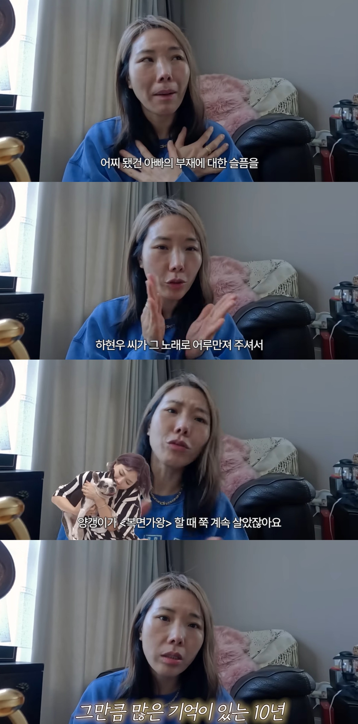 이어 신봉선은 3년 전 떠난 반려견 양갱이를 언급하며 "양갱이가 '복면가왕' 있을 때 쭉 살았다. 녹화가 늘 늦게 끝나 집에 오면 새벽 1시다. 양갱이 보내고 녹화하고 돌아오는데 '양갱이 잘 있었을까?' 이런 생각을 하더라"고 고백했다.