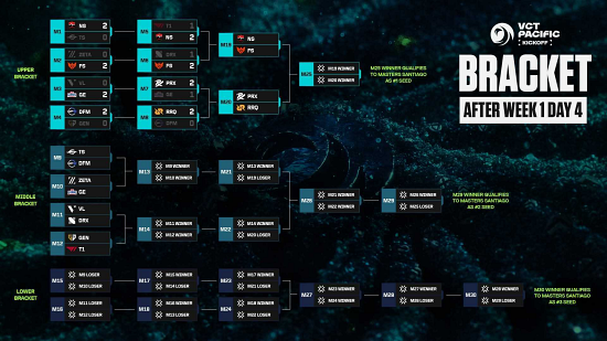데토네이션 포커스미와 젠지의 경기에서는 개막 주 최고의 이변이 나왔다. 데토네이션 포커스미가 'Meiy' 세키 이부키와 'yatsuka' 이케다 카즈야를 필두로 한 공격적 전술을 선보이며 젠지를 상대로 2대0 완승을 거뒀다. 데토네이션 포커스미는 VCT 퍼시픽에 참가한 이래 처음으로 2대0 완승을 거뒀고 그동안 4전 전패를 기록했던 젠지를 상대로도 마침내 첫 승리를 거뒀다. 상위조 8강에서 렉스 리검 퀀을 만난 데토네이션 포커스미는 노련한 운영을 넘지 못하고 0대2로 완패, 중위조로 내려갔다.