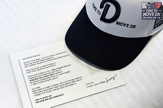 메시지 카드에는 '팬들이 열광하고 타 팀이 두려워하는 최강 두산의 자부심을 되찾자. 여러분 뒤에는 항상 든든하게 지원할 프런트와 열정적 팬들이 있다'는 내용과 함께 'TIME TO MOVE ON 이제 승리를 향해 다 같이 변화해 보자'라는 내용이 담겼다.