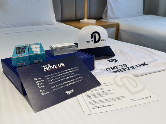 선물 패키지는 고영섭 대표이사가 직접 작성한 메시지 카드와 함께 슬로건 'Time to MOVE ON(타임 투 무브 온)'이 새겨진 티셔츠, 명함, 두산 베어스 스프링캠프 공식 후원사인 메디힐의 스킨 케어 용품 세트로 구성됐다.