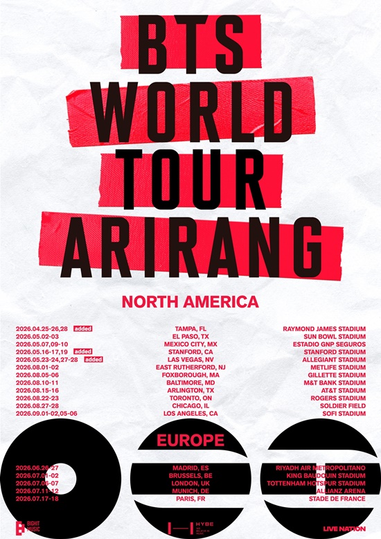 방탄소년단은 지난 24일까지 ‘BTS WORLD TOUR ‘ARIRANG’’ 북미와 유럽 공연 예매를 진행했다. 각 지역에서는 예매 시작 직후 스타디움급 공연장의 좌석이 빠르게 소진돼 글로벌 음악팬들의 뜨거운 관심을 실감케 했다.