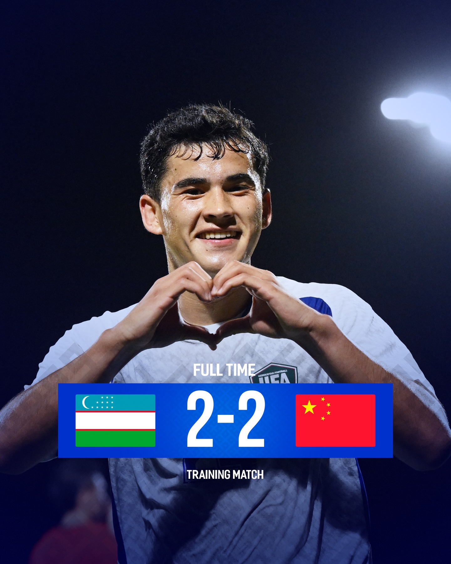비공개 35분씩 3쿼터로 진행된 친선 경기에서 먼저 골을 넣은 것이 중국이었다. 우즈베키스탄축구협회가 공개한 자료에 따르면, 중국은 12분 페널티킥으로 첫 득점에 성공했고 20분에 추가 골을 넣었다. 득점자가 누구인지는 공개하지 않았다.